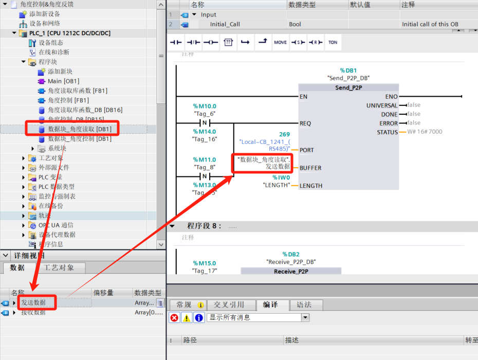 ③单击数据块,将数据块中的发送数据拖动到发送指令Send_P2P中的BUFFER中