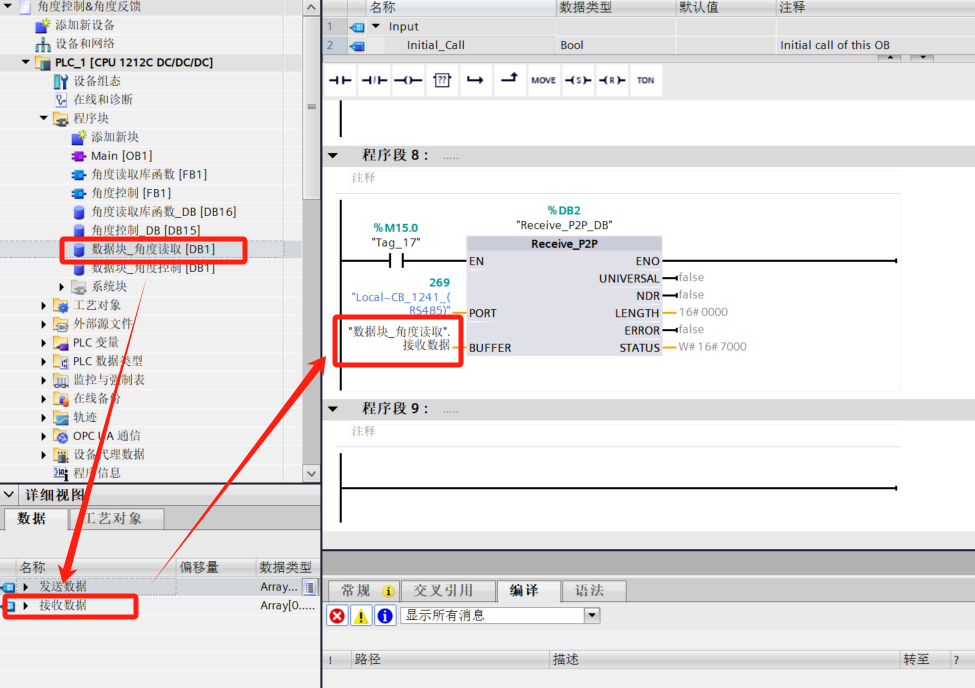 ④单击数据块,将数据块中的接收数据拖动到接收指令Receive_P2P中的BUFFER中