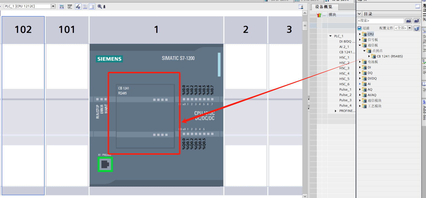 ①在设备组态中添加PLC型号,将CB 1241(RS485)通信板加入组态中