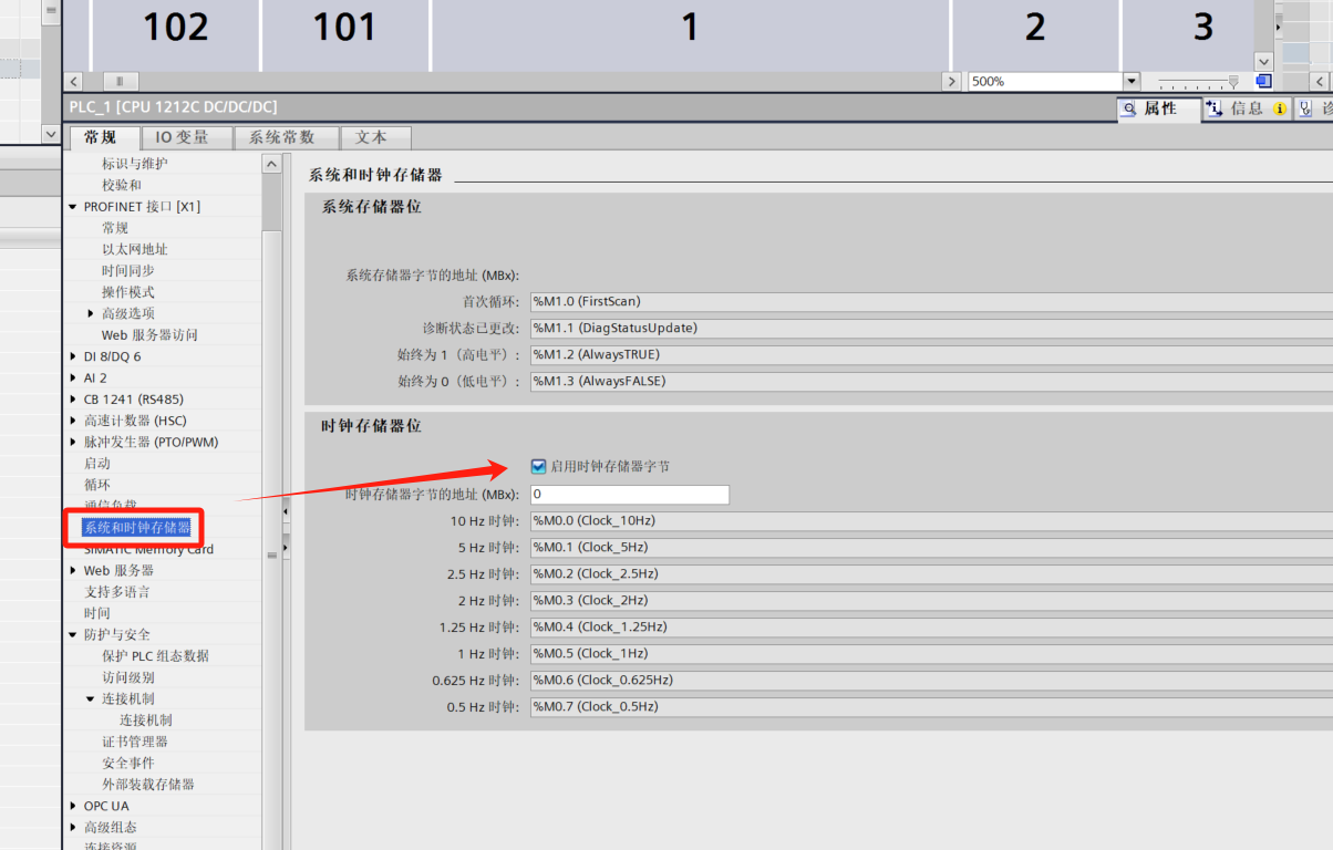 ②鼠标左键双击PLC设备,选择''系统和时钟存储器'',勾选''启用系统存储器字节''和''启用时钟存储器字节''