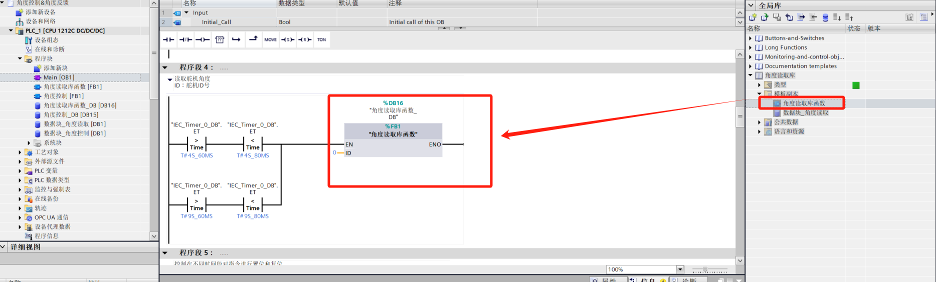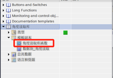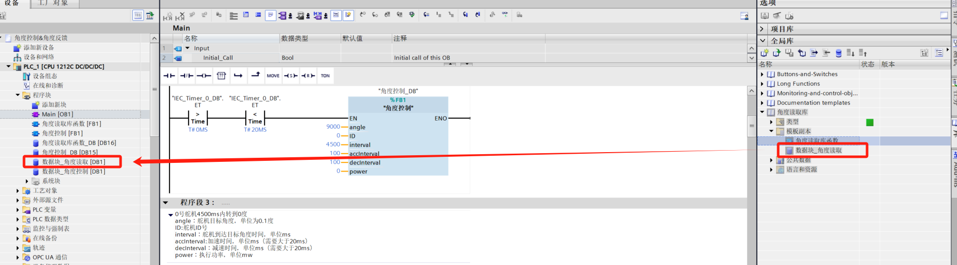 ②打开后可以看到已经添加入其中,在模板副本中拖动FB函数(库函数)到程序中并填写好参数,将数据块拖动到最左侧程序块中